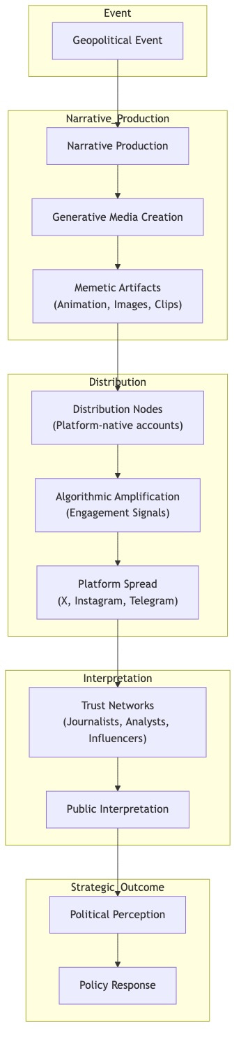 (Conceptual model of the interpretation domain. A geopolitical event triggers narrative production and generative media creation, producing memetic artifacts such as images, animations, and short‑form clips. These artifacts propagate through platform‑native distribution nodes where algorithmic amplification prioritizes emotionally engaging content. As narratives spread across platforms, they enter trust networks composed of journalists, analysts, and influencers who act as interpretive filters. The resulting public interpretation shapes political perception and can ultimately influence policy responses.)